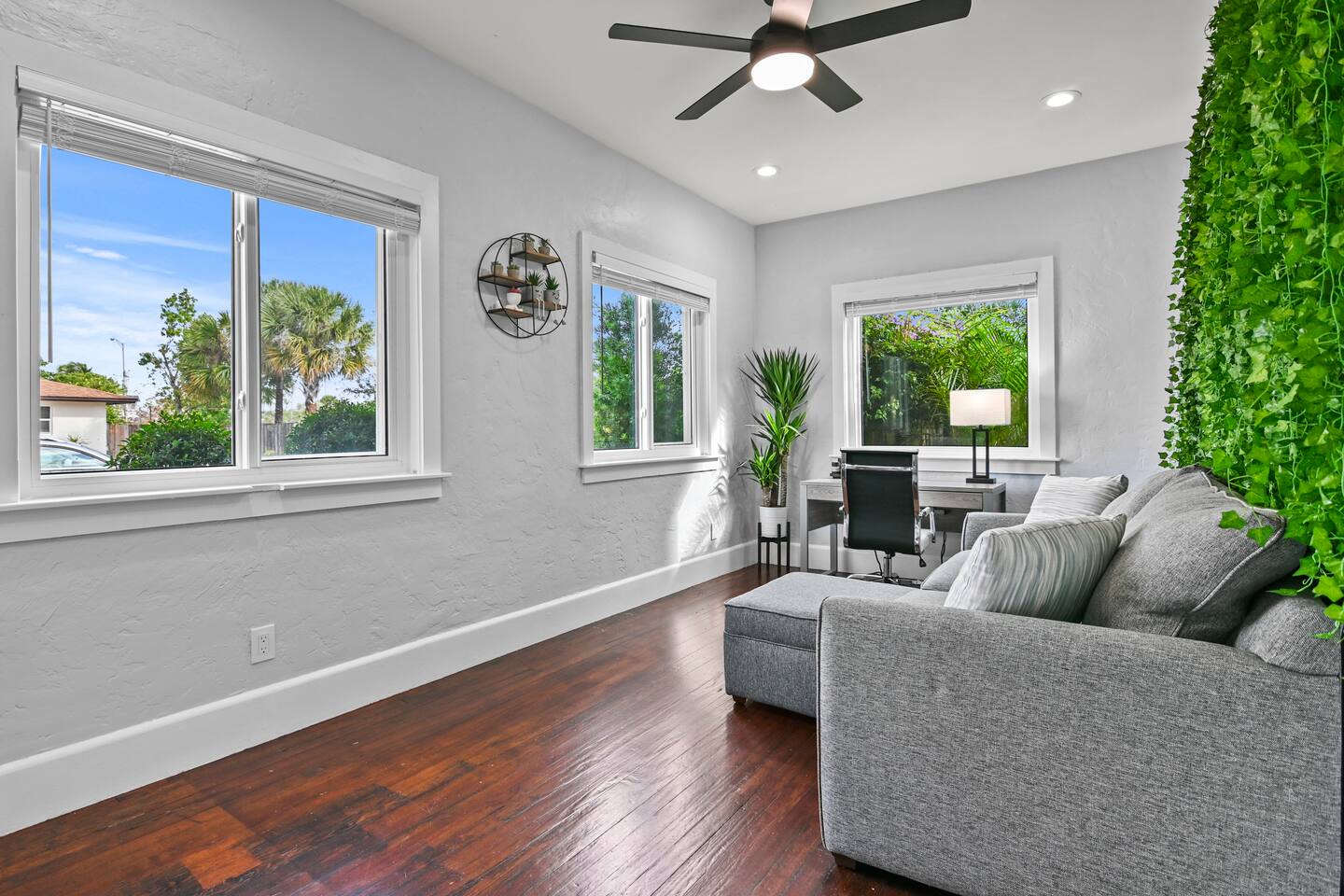 The home offers a gated driveway as well as free street parking. The home sits just off the bus line, and the brightline station is just minutes away.
