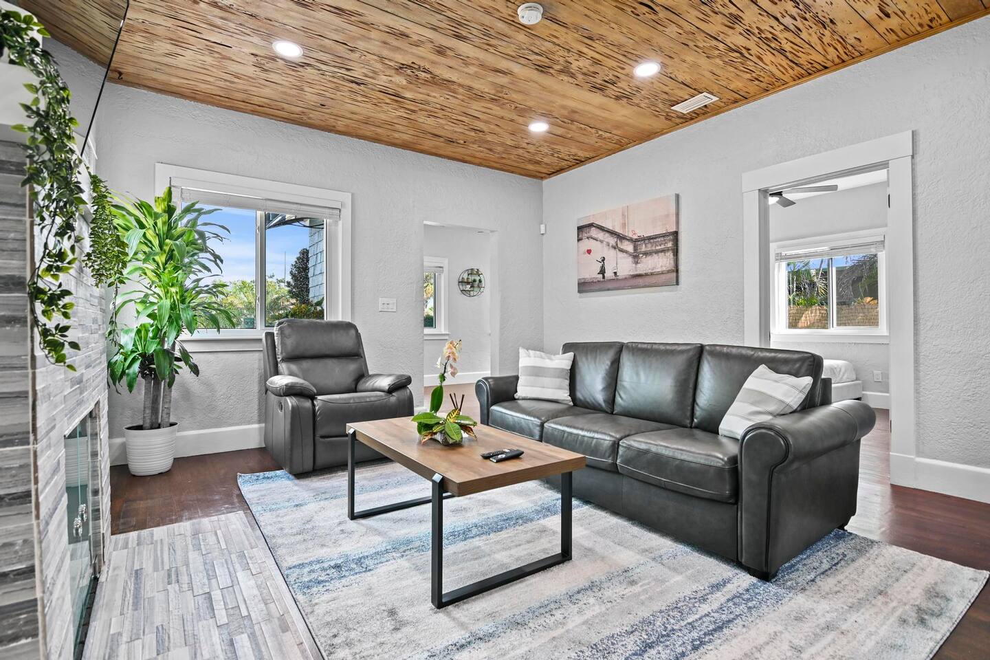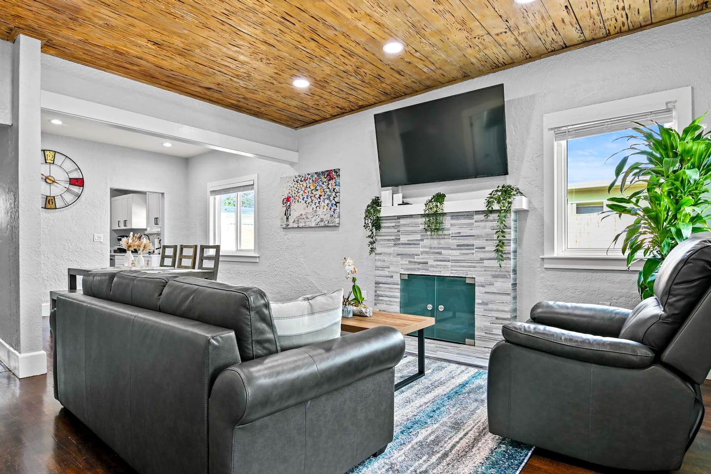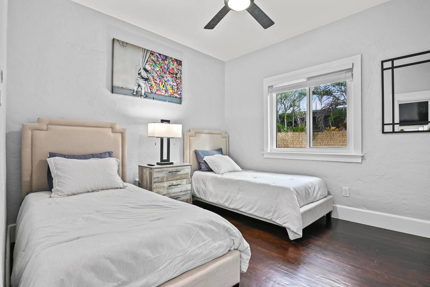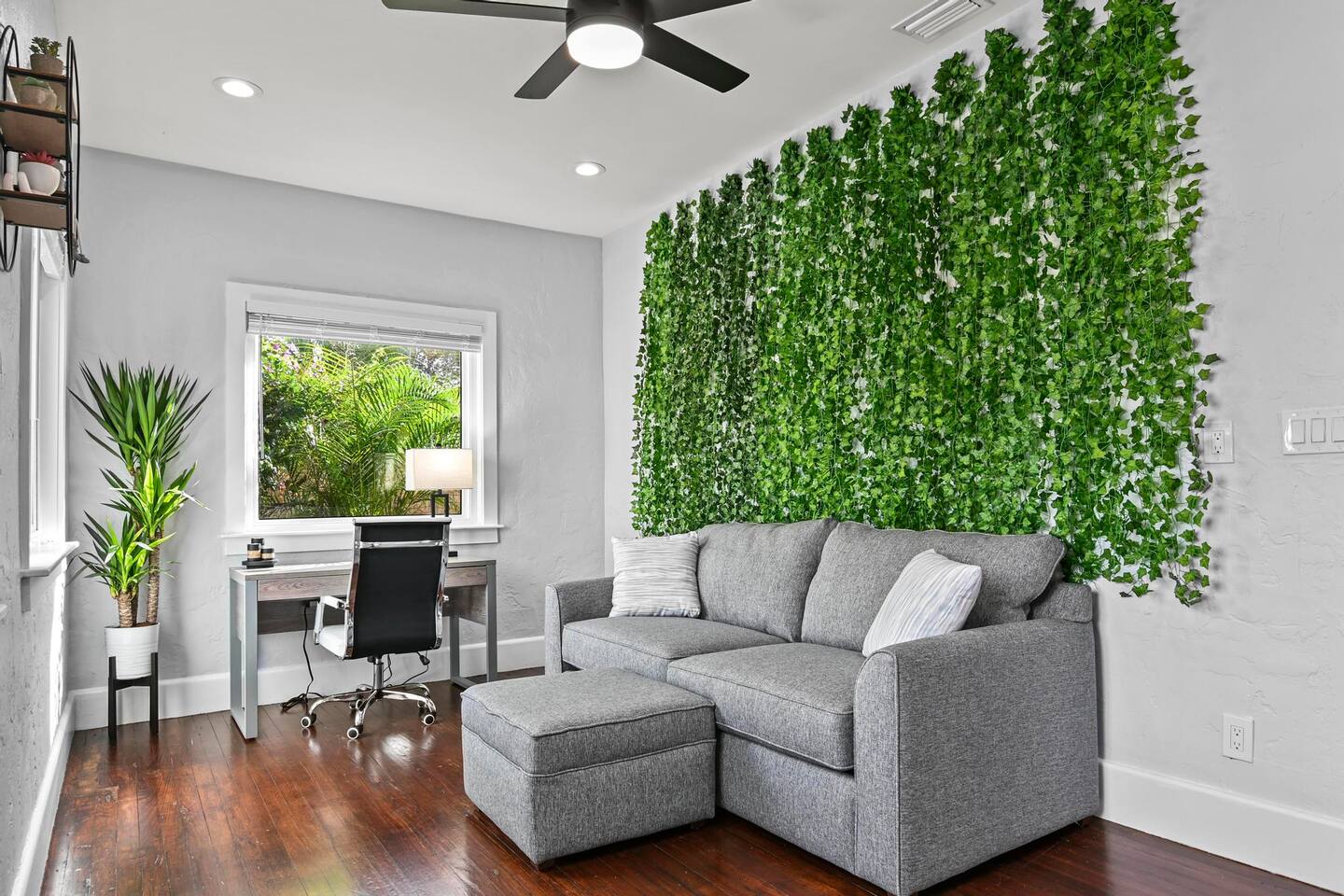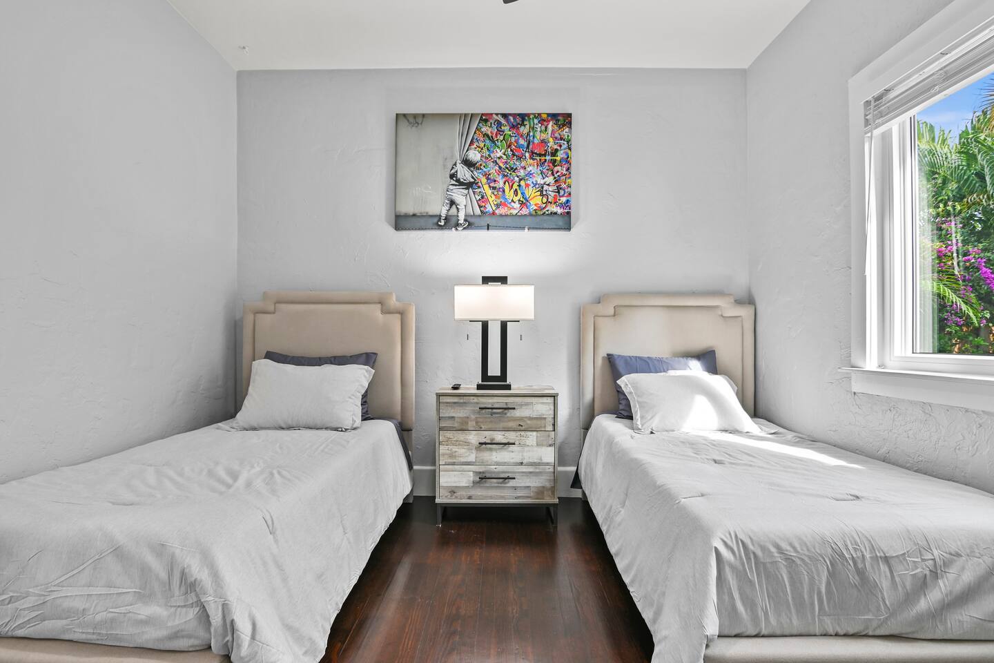 Discover the perfect blend of comfort, convenience, and local charm at our exquisite West Palm Beach home. This family-friendly retreat offers everything you need for a memorable vacation, including central air conditioning, a cozy gas fireplace, and lightning-fast Wi-Fi (803 Mbps). Located just minutes from West Palm Beach International Airport, downtown, Antique Row, historic Lake Worth Beach, Palm Beach Island, Boca Raton, and Delray Beach, our home provides easy access to all the area's top attractions. Enjoy the tropical courtyard and garden views, free driveway parking, and a single-level, pet-friendly layout with smart lock self-check-in. Inside, the spacious master bedroom features a king-sized bed with a cooling memory foam mattress, a large HD TV with streaming services, and premium linens. The second bedroom offers two twin beds, high-thread-count linens, and another HD TV. The thoughtfully designed bathroom includes luxurious toiletries, hot water, and an in-unit washer and dryer. Relax in the inviting family room with a queen-sized sofa bed, modern office desk, and tropical plants. The living and dining area boasts a leather couch, recliner, 65" HDTV with extensive streaming options, and a stylish dining setup. Our fully equipped kitchen has stainless steel appliances, white quartz countertops, an espresso machine, Keurig, gas range, and spacious cabinets. Step outside to a beautifully landscaped yard, complete with a fire pit, patio furniture, and free-use bicycles. Enjoy the shared hot tub (shared with a detached Airbnb cottage behind the home) for year-round relaxation. As a delightful bonus, two friendly kitties have made the backyard their home and love to greet guests. With its prime location and luxurious amenities, our West Palm Beach home is the perfect choice for an unforgettable family vacation.